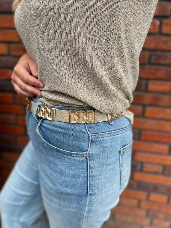 Fijne elastische riem. Stijlvol en confortabel! Deze elastische riem in de kleur glitterkleur past zich moeiteloos aan je taille aan en heeft prachtige gouden details.