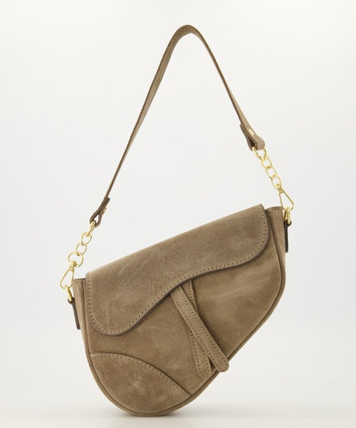 Gigi is een zadelvormige tas gemaakt van genuine leer. De tas heeft twee hengsels, een kortere om als handtas te dragen en een langer verstelbaar hengsel om als crossbodytas te dragen. De crossbody tas heeft goudkleurige hardware en wordt gesloten met magneetsluitingen. Aan de binnenzijde zit een vakje met een ritssluiting.