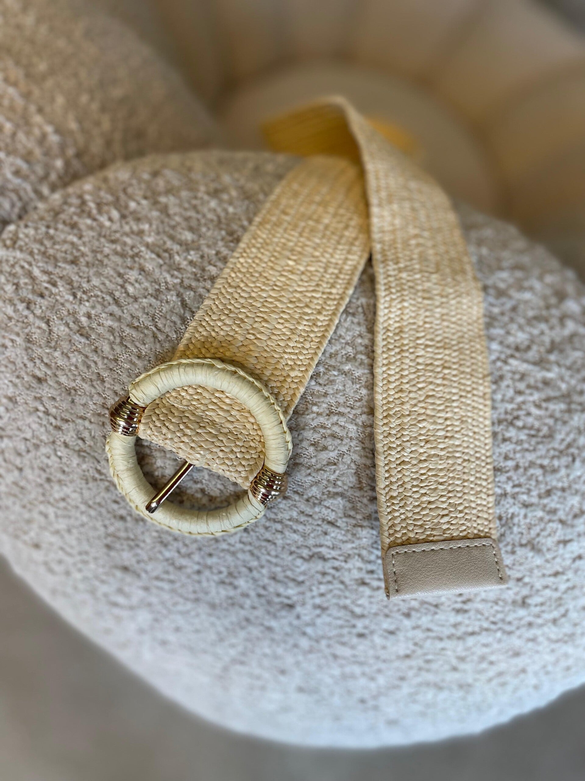 Fijne riem. Stijlvol en confortabel! Deze riem in de kleur beige en goud past zich moeiteloos aan je taille aan en heeft een prachtige goudkleurige gesp.